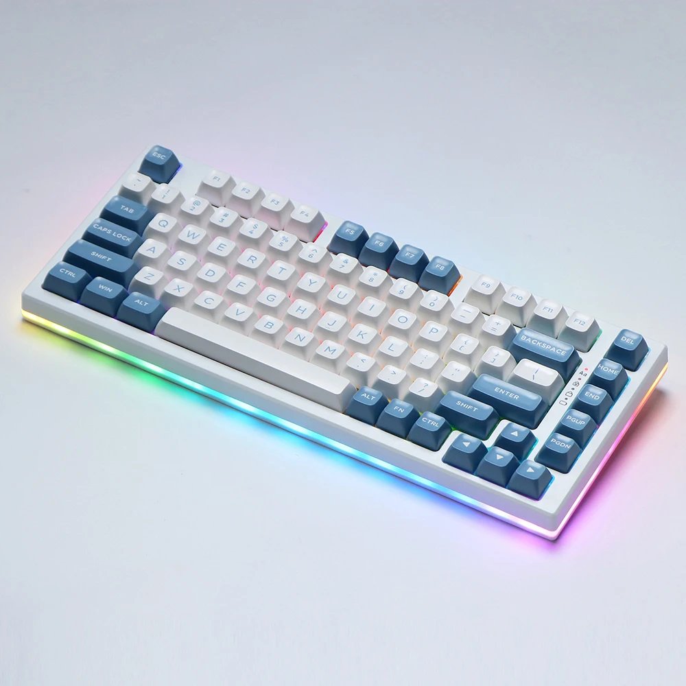 At the heart of this technological marvel lies the exquisite GMK+ Blue keycap set, each key a canvas of vivid cobalt hues that beckon creativity with every press. The legends, meticulously rendered, invite your fingers to navigate a sea of letters and symbols with a tactile response that feels as gratifying as composing a sonnet with a quill.