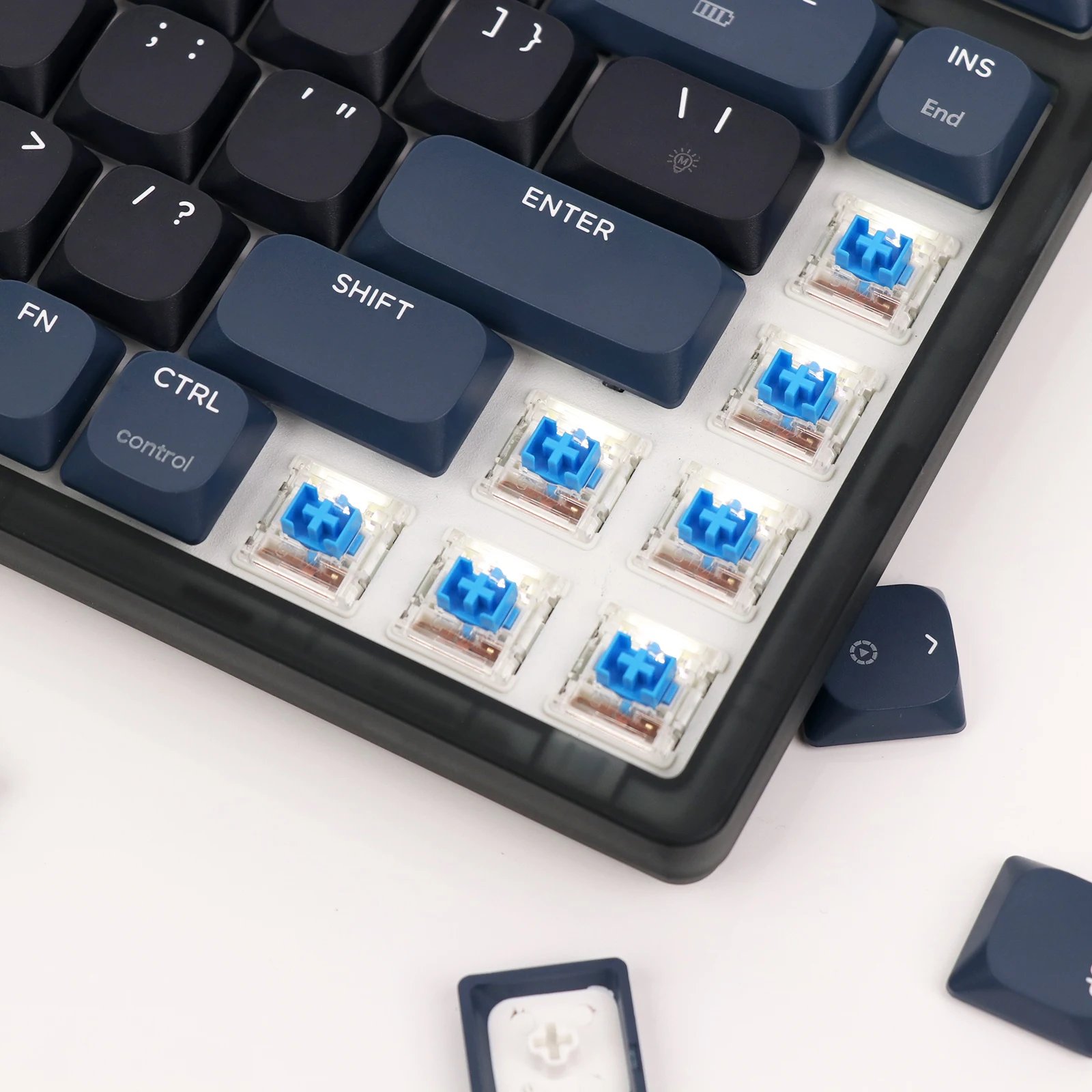 Picture a vast expanse of navy blue, reminiscent of a moonlit ocean, adorning each keycap with a richness that captivates the senses. These aren’t just keycaps; they’re miniature works of art, sculpted to perfection. The legends, resplendent in crisp, contrasting white, dance across the sea of blue, guiding your fingers through the labyrinth of possibilities.