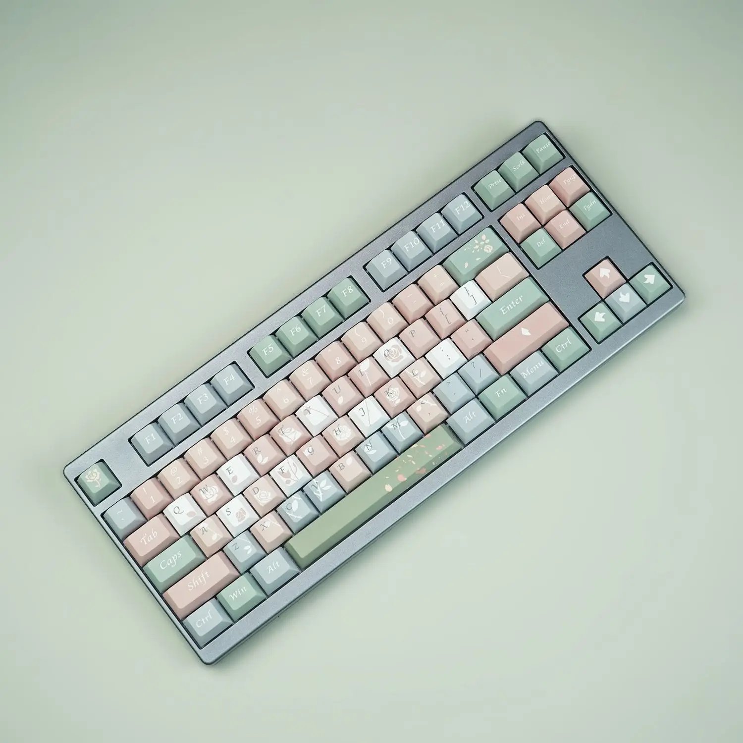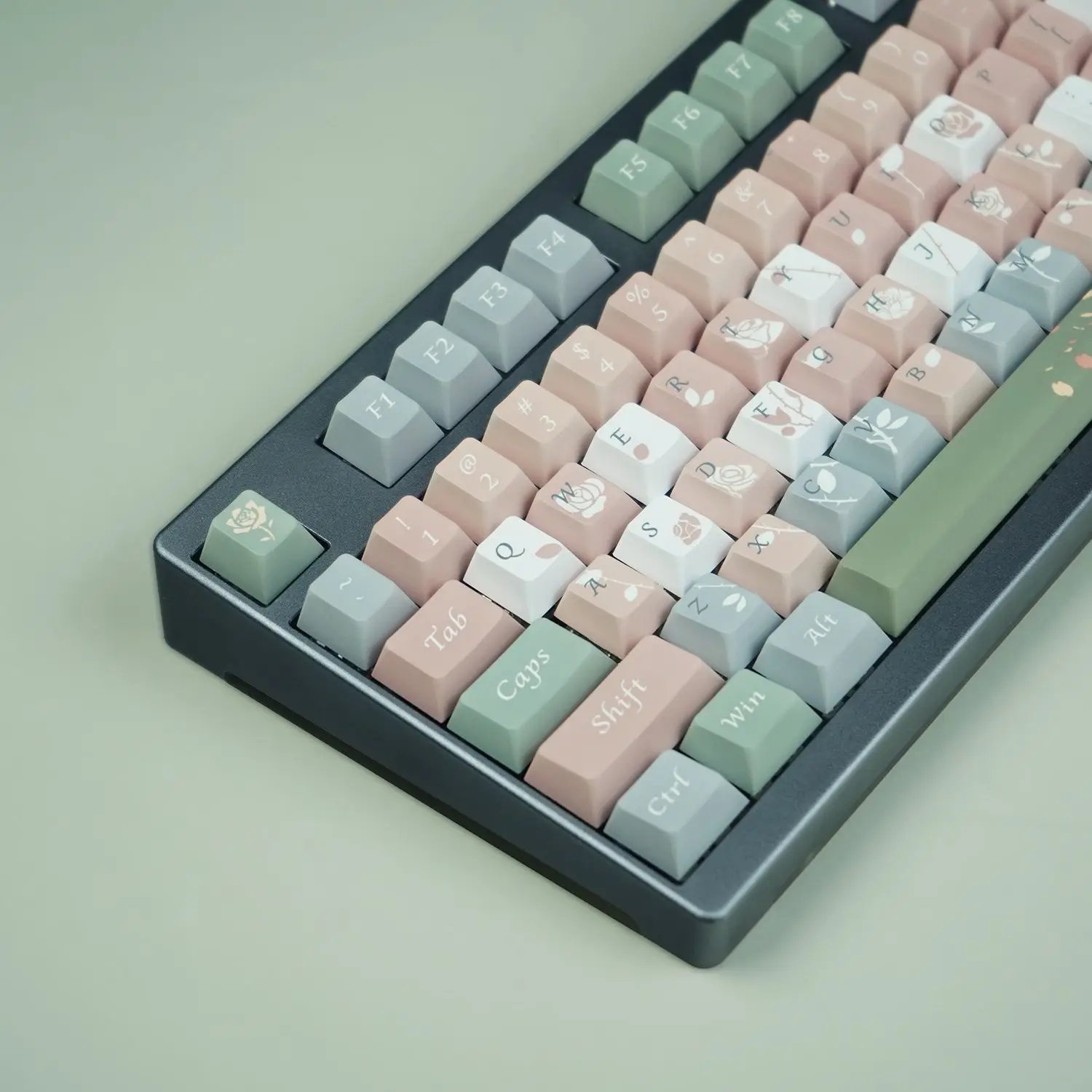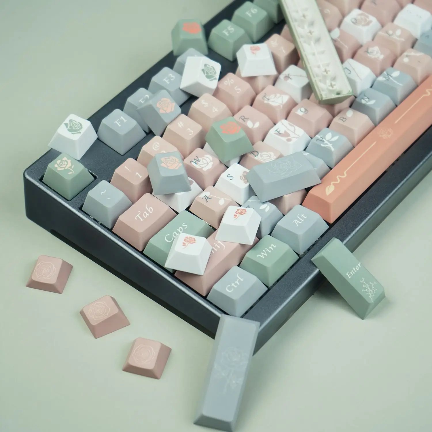 Comprising a total of 125 keycaps, each element of this set is a testament to quality and detail. With a comprehensive assortment of keys, including modifiers, alphas, and novelties, this set allows for complete customization while maintaining a harmonious aesthetic.Juego de teclas de perfil de cereza, rosa claro, verde, lindo Teclado mecánico, elemento Rosa Vintage, personalizado